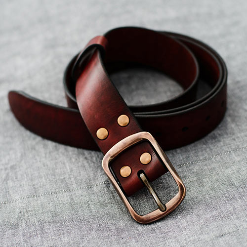 Плотная бычья кожа с природной фактурой. Цвет — винтажный бургунди с ручной тонировкой.