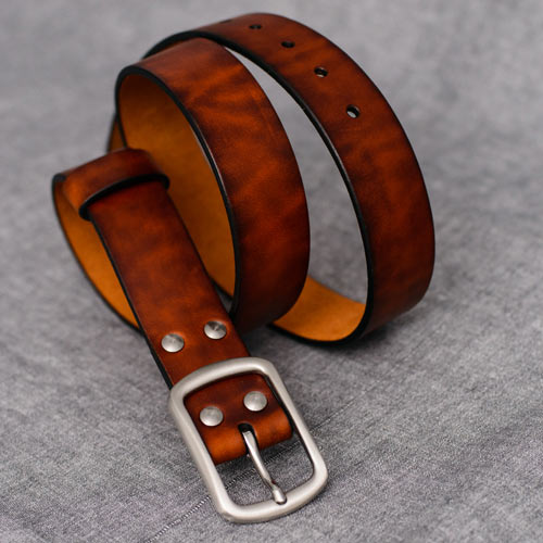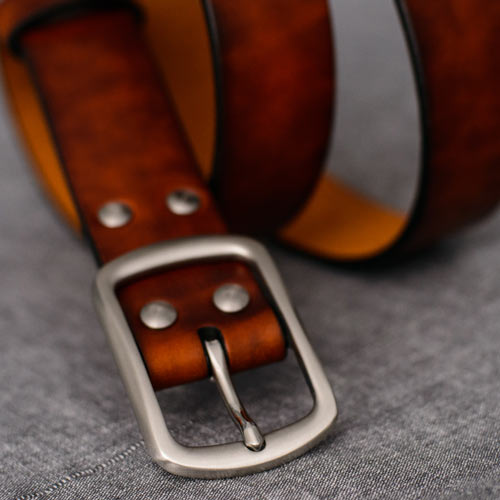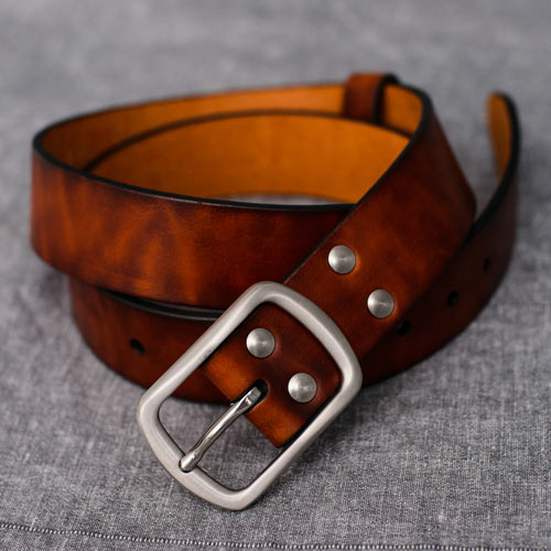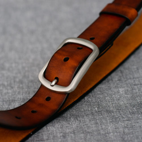 Плотная бычья кожа с природной фактурой. Цвет — ирландский рыжий с ручной винтажной тонировкой.