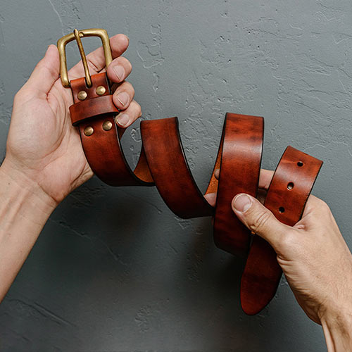 Плотная бычья кожа с природной фактурой. Цвет — ирландский рыжий с ручной винтажной тонировкой.
