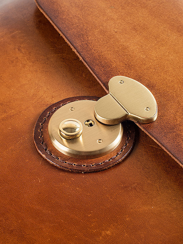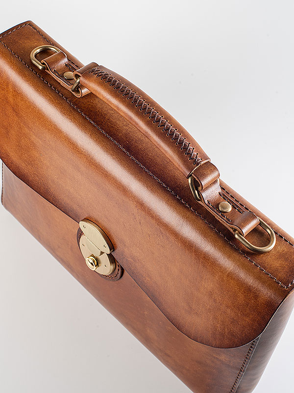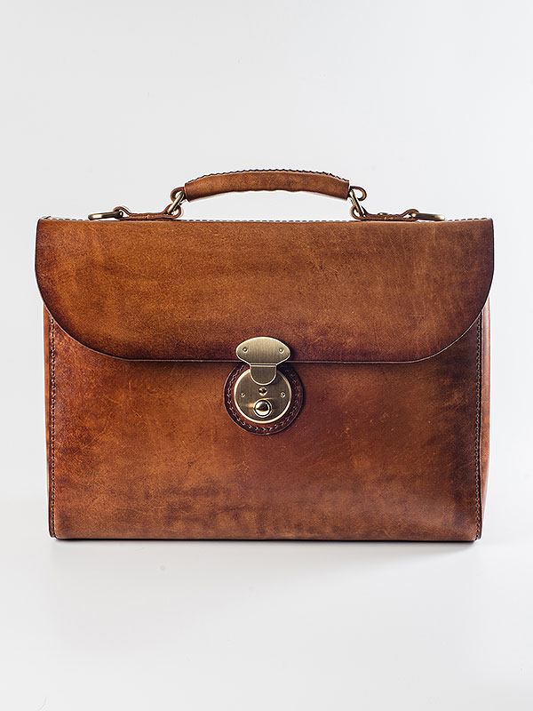 Портфель прошит вручную широкой плетёной нитью — шов не перетрётся и не распустится. Фурнитура из литой латуни не лопнет и не облезет. Замок — проверенного швейцарского бренда.