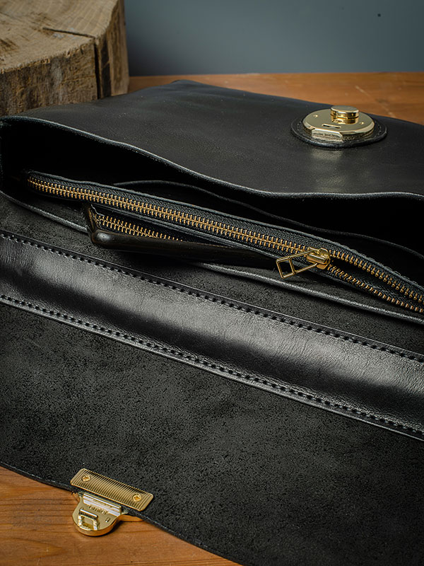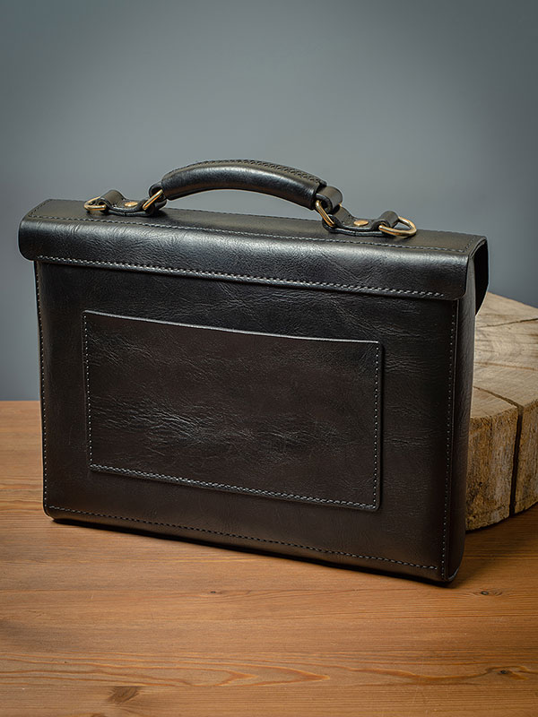 В портфеле плоский карман, отделение на молнии, главное отделение и открытый карман на тыльной стороне.