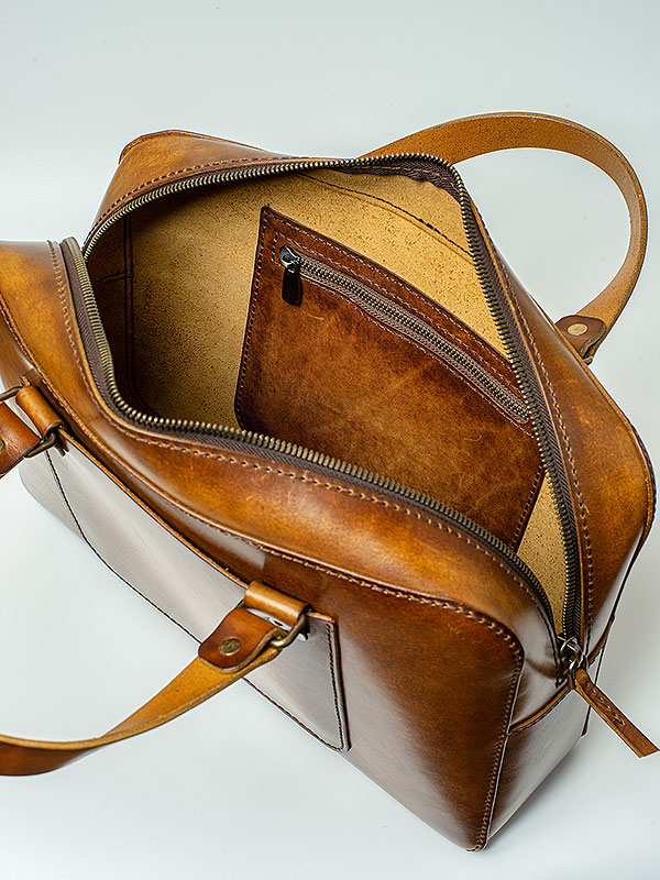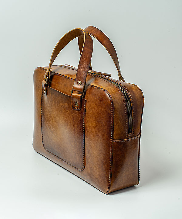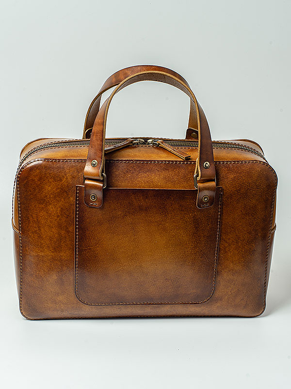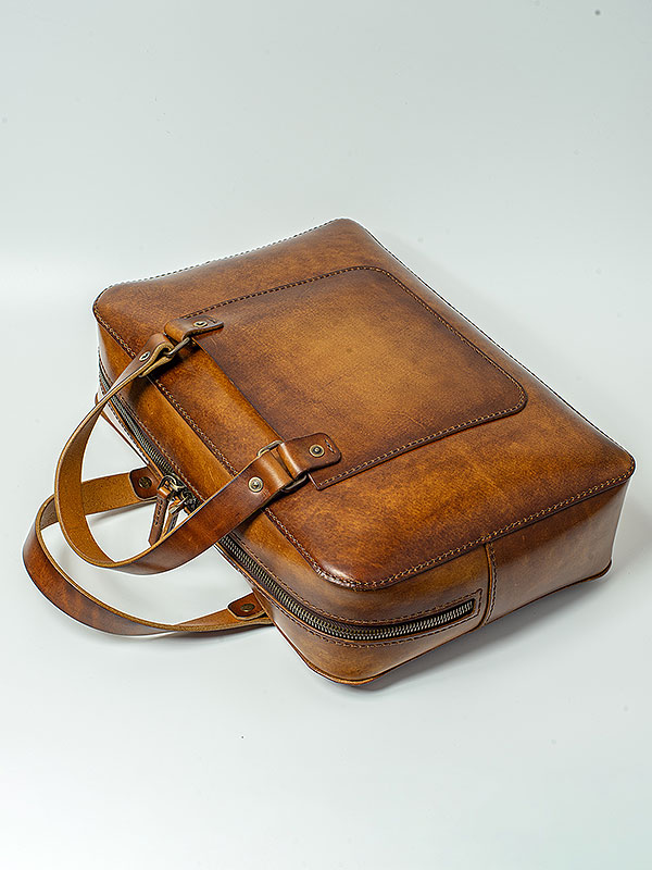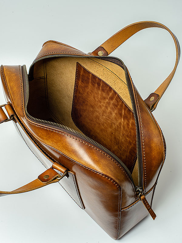 Портфель прошит вручную широкой плетёной нитью — не только дань традиции, но и повышенная прочность шва. Дизайн портфеля современный, но ручная отделка кожи создает впечатление винтажной консервативной вещи.